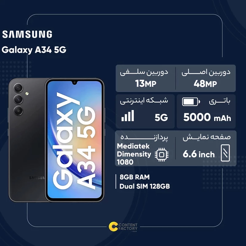سامسونگ در زمینه گوشی‌های هوشمند میان‌رده تا به امروز توانسته است با معرفی محصولاتی با مشخصات فنی مناسب و قیمتی مقرون به‌صرفه، عملکرد بسیار خوبی را به نمایش بگذارد. سامسونگ Galaxy A34 5G هم یکی از این گوشی‌های هوشمند دوست داشتنی این شرکت است. صفحه‌نمایش جذاب و قدرتمند 6.6 اینچی این گوشی با رزولوشن بسیار خوب و نرخ بروزرسانی فوق‌العاده 120 هرتز، چیزی کم از یک پرچمدار ندارد و سامسونگ دوباره ثابت کرد که در زمینه صفحه‌نمایش هنوز هم حرف‌های بسیاری برای گفتن دارد. در بخش سنسور‌های دوربین هم سنسور دوربین عریض 48 مگاپیکسل این گوشی توانایی ثبت تصاویر بسیار جذاب و باکیفیتی را در نور روز و نور شب دارد. سنسور دوربین فوق‌عریض 8 مگاپیکسل این گوشی هم با زاویه دید 123 درجه، امکان ثبت تصاویر جذابی را در طبیعت و فضای باز دارد. سنسور دوربین 5 مگاپیکسل ماکرو هم برای ثبت تصاویر از فاصله نزدیک این گوشی را همراهی می‌کند. دوربین سلفی 13 مگاپیکسل این گوشی هم سوای عمکلرد بسیار خوب در نور روز، توانایی فیلمبرداری با نهایت کیفیت 4K را دارد. پردازنده دیمنسیتی 1080 شرکت مدیاتک هم این گوشی را همراهی می‌کند که سوای عملکرد بسیار خوب در اجرای بازی‌ها حتی سنگین، سبب شده تا این گوشی همانطور که از نامش پیداست، توانایی پشتیبانی از شبکه‌های اینترنتی نسل پنجم یا همان 5G را داشته باشد. باتری با میزان ظرفیت 5000 میلی‌آمپرساعت هم به ازای هر بار شارژ صد درصدی در حالت استفاده معمولی، طول عمر مفید (زمان آماده به‌کار) دو روز را ارائه می‌کند. در مجموع باید بگوییم که اگر به دنبال خرید گوشی میان‌رده‌ای هستید که از صفحه‌نمایشی در حد و اندازه یک گوشی پرچمدار، سنسورهای دوربین متنوع و قدرتمند و پردازنده مناسب برای اجرای بازی‌های سنگین بهره برده باشد، این گوشی می‌تواند یکی از بهترین انتخاب‌های ممکن باشد. بستن